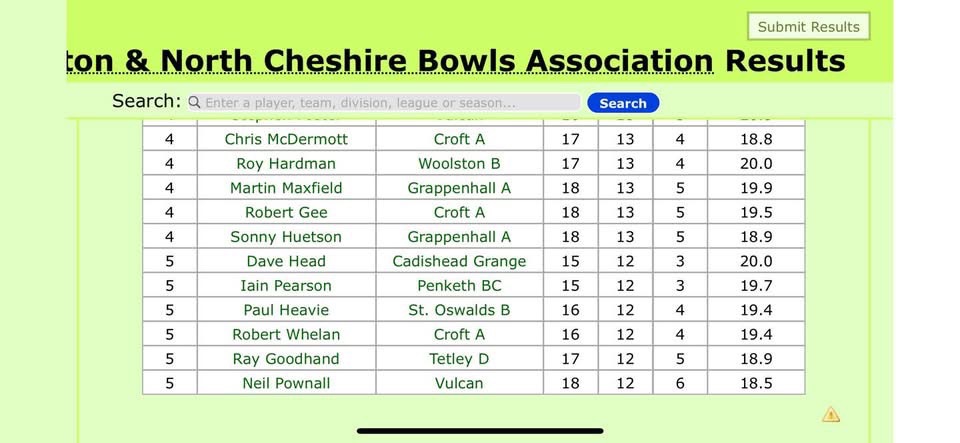 Firstly well done to Croft men’s Monday night A team who were the winners of the Warrington and North Cheshire Bowls Association Section B by 8 points from runners up Grappenhall A. A special mention goes to Rob Gee, Rob Whelan and Chris McDermott who all appeared in the leading players chart as shown below. Well done to them and to the whole of the squad under the captaincy of Andrew Hart.