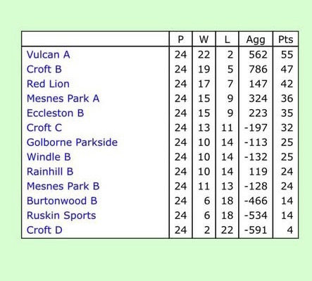 Last season was an excellent year for the Croft B team, winning nineteen out of the twenty-four matches. This allowed us to finish second in the division and hopefully gain promotion after being relegated the season before. Three matches stand out in the memory. On a rainy cold afternoon we won at Rainhill, followed by a spectacular second half display at the Red Lion, after being well down. The jewel in the crown must be an away win at Butts Park, the runaway winners of the league, in one of the closing matches of the season which helped us to the runners up spot.